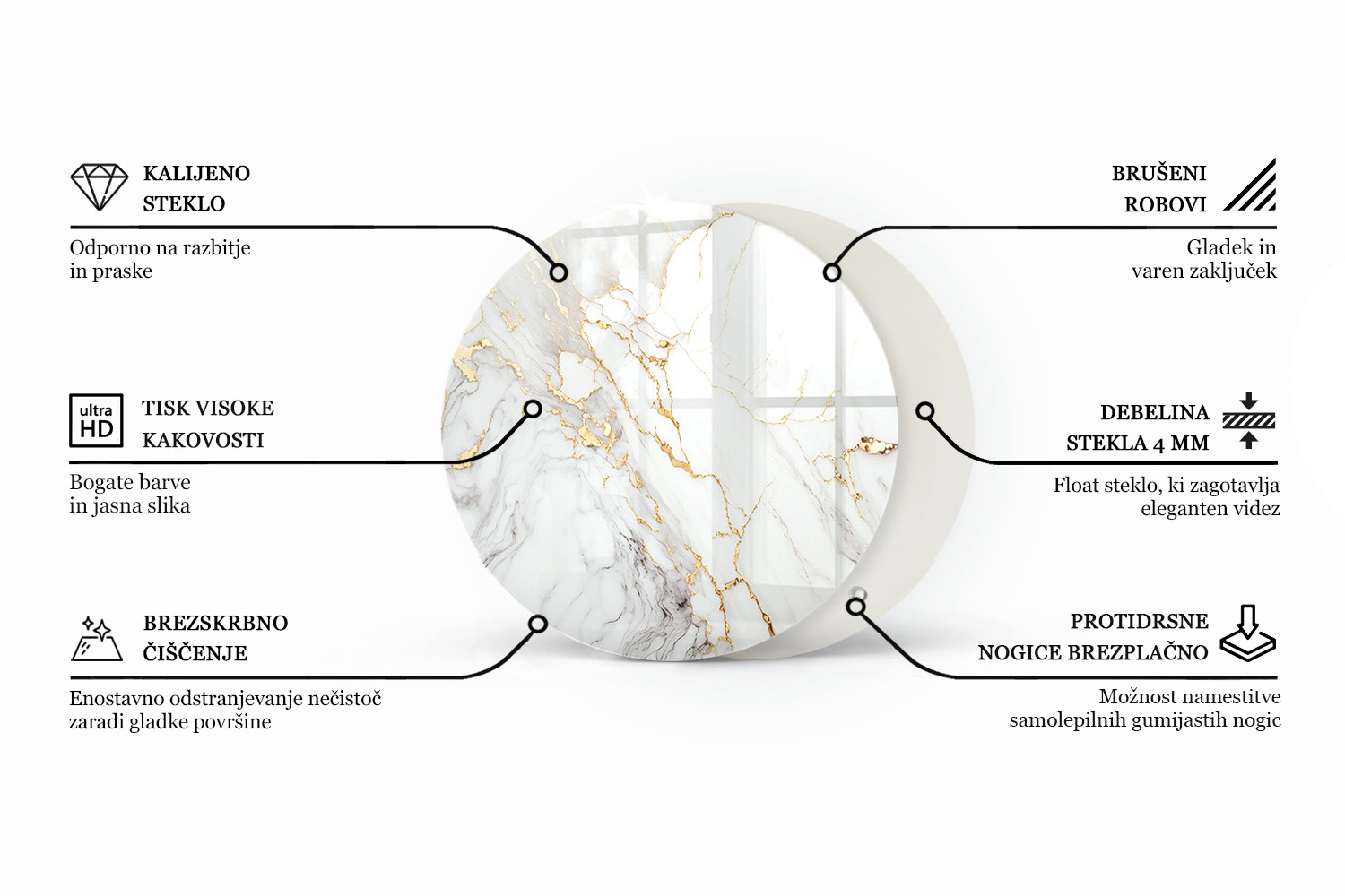 - Okrogla steklena mizna plošča z natisom Marmorni teksturni motiv